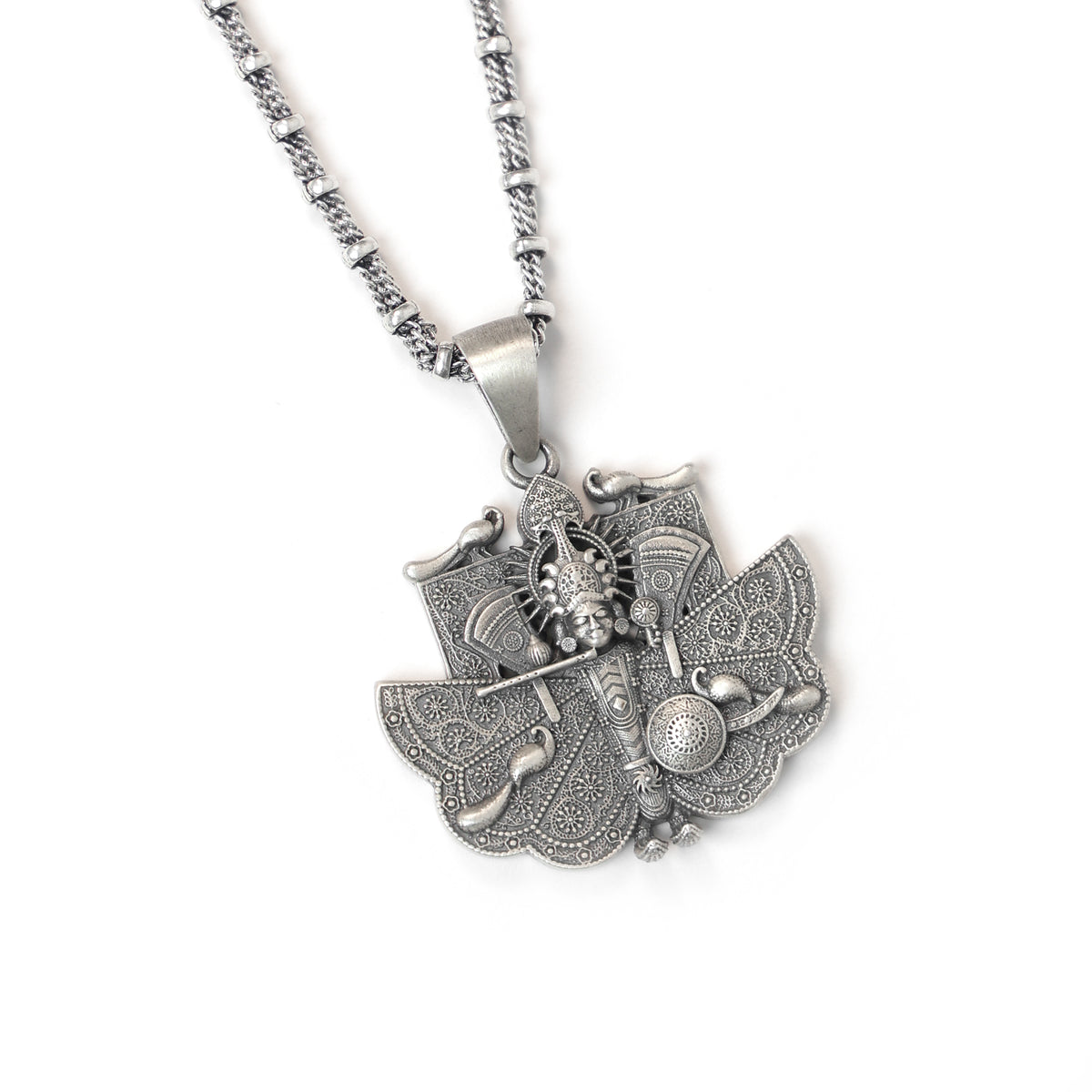 This Silver Sanwariya Seth Pendant is meticulously crafted from 925 sterling silver, symbolizing divine protection, prosperity, and devotion. The design features Sanwariya Seth, a revered figure, beautifully depicted with intricate detailing, bringing blessings of wealth, strength, and spiritual growth.